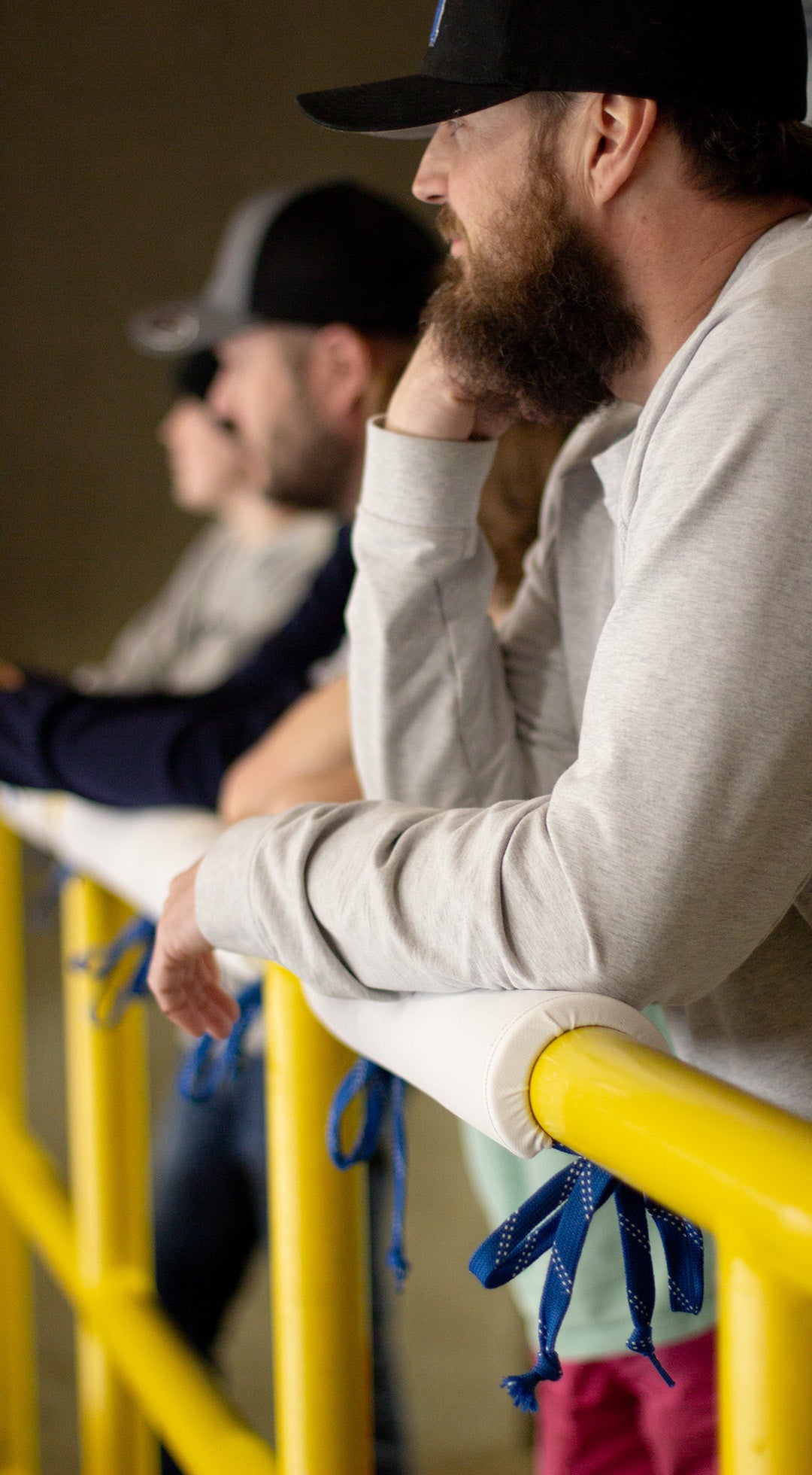 That was the line that sparked it all, and soon everything began to fall into place. Both Derek and James suffer from back pain, so sitting in the bleachers quickly becomes uncomfortable. Leaning forward on the railing, resting on their forearms, gave them a chance to stretch and find more comfort.